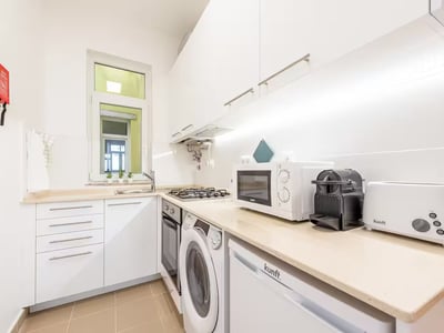 - cozinha completa e totalmente equipada (frigorífico, fogão, forno, micro-ondas, chaleira elétrica, máquina de café Nespresso, torradeira e máquina de lavar e secar roupa);